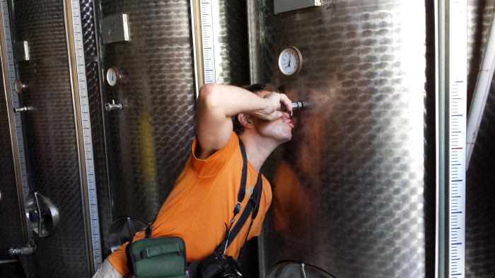 Iemaldāmies reālā ražotnē, kur tvertnes tiešām ir pilnas ar svaigu vīnu. Tie jau nebūtu letiņi, ja neizmantotu šādu izdevību:)