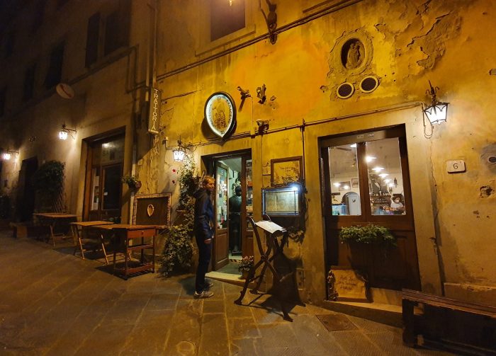 Iegriežamies kādā no Arezzo lieliskajiem restorāniņiem. Vēl viena Toskānas klasika – vīnā un garšvielās šmorēts cūkas stilbiņš. Labs!
