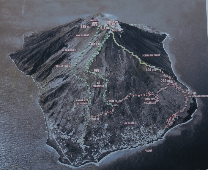 Mario pa ceļam mums daudz stāsta par Sromboli. Stromboli aktivitāte turpinoties jau 2000 gadus. Tas esot nejauks – eksplozīvs vulkāns. Lava nevis mierīgi plūstot, bet gan tiekot izšauta sprādzienu veidā apmēram 200 m augstumā kopā ar kvēpiem un gāzēm. Sprādzieni nav regulāri un var atkārtoties gan nākamajā minūtē, gan tikai pēc stundas. 2002, 2003, 2007, 2009 un 2013. gadi iezīmējas ar nopietnām eksplozijām, kas mainījušas krātera formu. Mario stāsta, ka šādas eksplozijas gadījumā gaisa vilnis mūs izmētātu kā zirņus no virsotnes līdz pašai jūrai. Reiz šādā eksplozijā milzu akmens esot uzkritis tieši uz viņa mājas jumta un sagrāvis vienu sienu. Labi, ka neviens neesot bijis mājās.