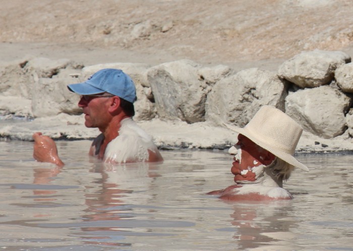 Dubļu vannā nav nemaz tik viegli iekāpt. Tievas tvaika strūkliņas izplūst no baseina dibena ik uz soļa. Vairākas reizes nepatīkami apdedzinu pēdas. Vēl trakāk ir atrast drošu vietiņu, kur apsēsties.