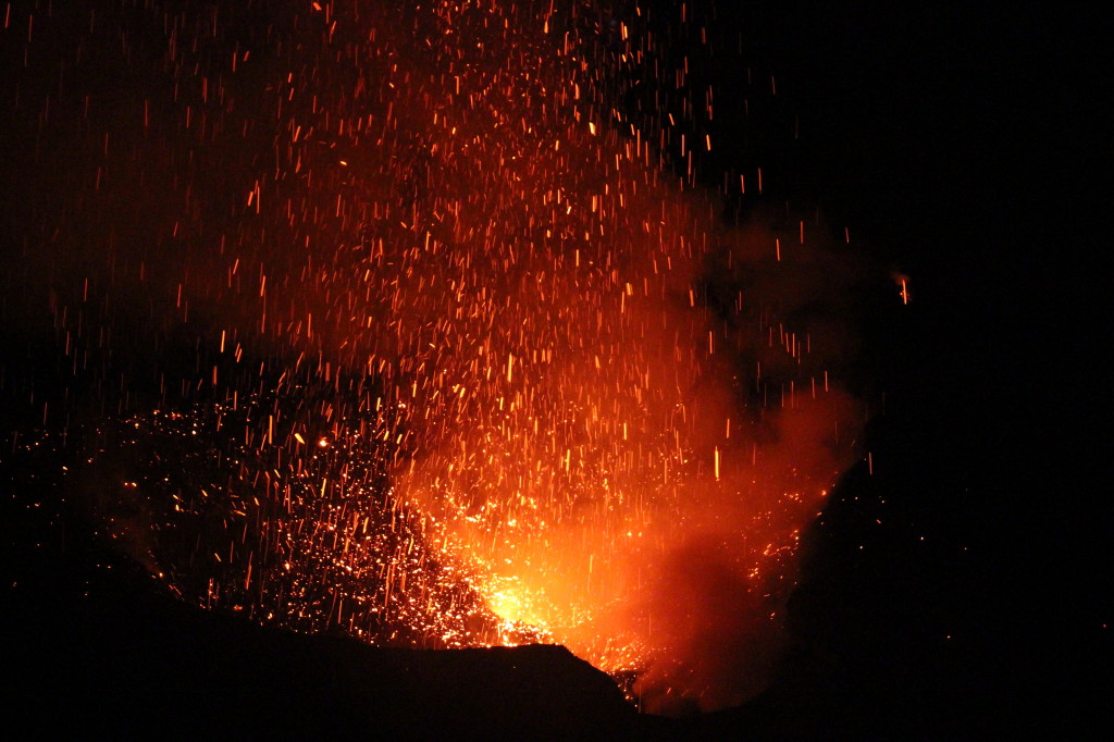 Drošības apsvērumu dēļ virsotnē drīkstam uzkavēties ne ilgāk kā stundu. Šovakar Stromboli mums ir labvēlīgs un spļauda lavu pa veseliem 2 krāteriem. Arī vēja virziens ir perfekts – dūmu mākonis tiek nests prom no mums un no krātera. Tādējādi mums ir tā laime izbaudīt Stromboli izrādi visā tās krāšņumā. Mums zem kājām vārās sarkans lavas katls. Garaiņi tajā veido dažādas spocīgas figūras.